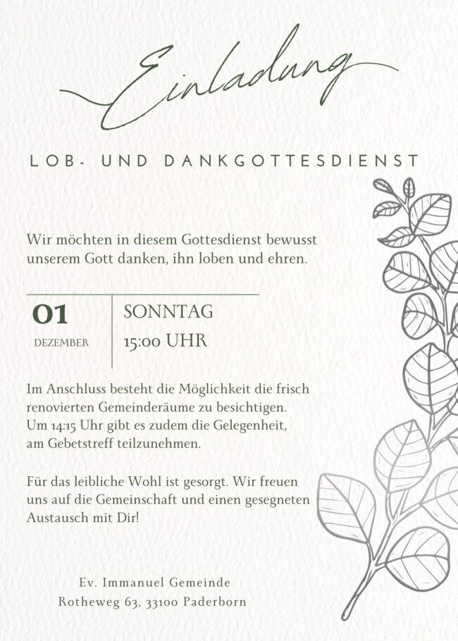 Herzliche Einladung zu unserem Lob- und Dankgottesdienst! In dem Gottesdienst möchten wir bewusst unseren Gott loben und Preisen und Ihm für seine große Liebe und Güte danken!