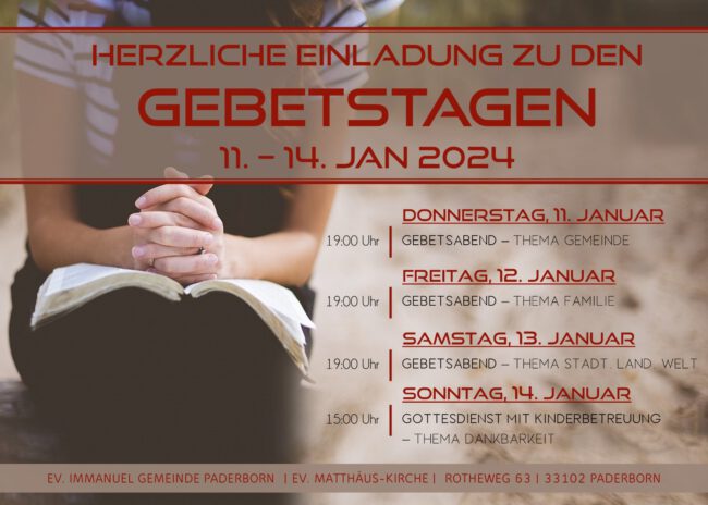 Herzliche Einladung zu den Gebetstagen in der Immanuel Gemeinde Paderborn! Thema: Segen für Familien, Stadt und Nationen. Suchet der Stadt Bestes. Jeremia 29,7