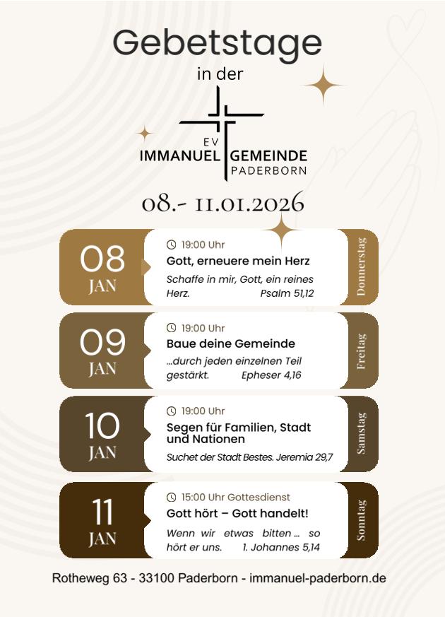 Herzliche Einladung zu den Gebetstagen in der Immanuel Gemeinde Paderborn! Thema: Gott erneuere mein Herz. Schaffe in mir, Gott, ein reines Herz. Psalm 51,12