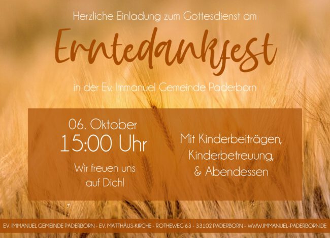 Herzliche Einladung zu unserem Erntedankfest! Alle guten Gaben kommen von Gott und dafür möchten wir Ihm an diesem Sonntag besonders danken! Mit Kinderbeiträgen, Kinderbetreuung und Abendessen!
